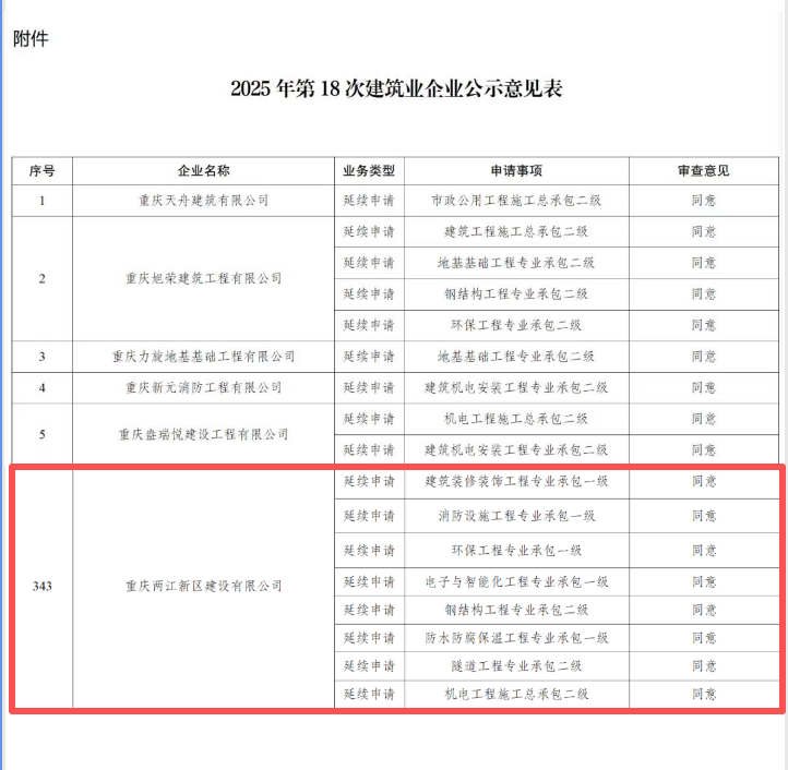 近日,重慶市住房和城鄉(xiāng)建設(shè)委員會正式發(fā)布《2025年第18批次建筑業(yè)企業(yè)資質(zhì)審查意見公示》,重慶兩江新區(qū)建設(shè)有限公司申報(bào)的建筑業(yè)企業(yè)資質(zhì)已通過市級主管部門的嚴(yán)格審查,進(jìn)入公示階段。